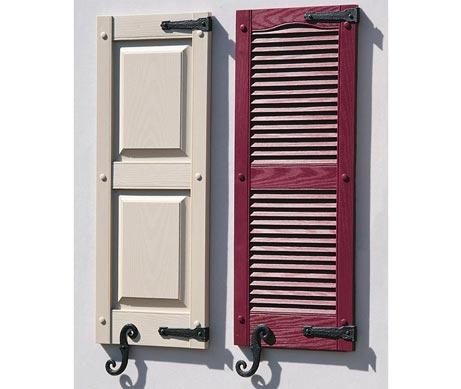 Exterior shutters provide a distinctive look to the outside of a home, enhancing “curb appeal” with a timeless look of traditional European beauty that is both decorative and inexpensive. Exterior shutters come in many in many materials and designs, including:
